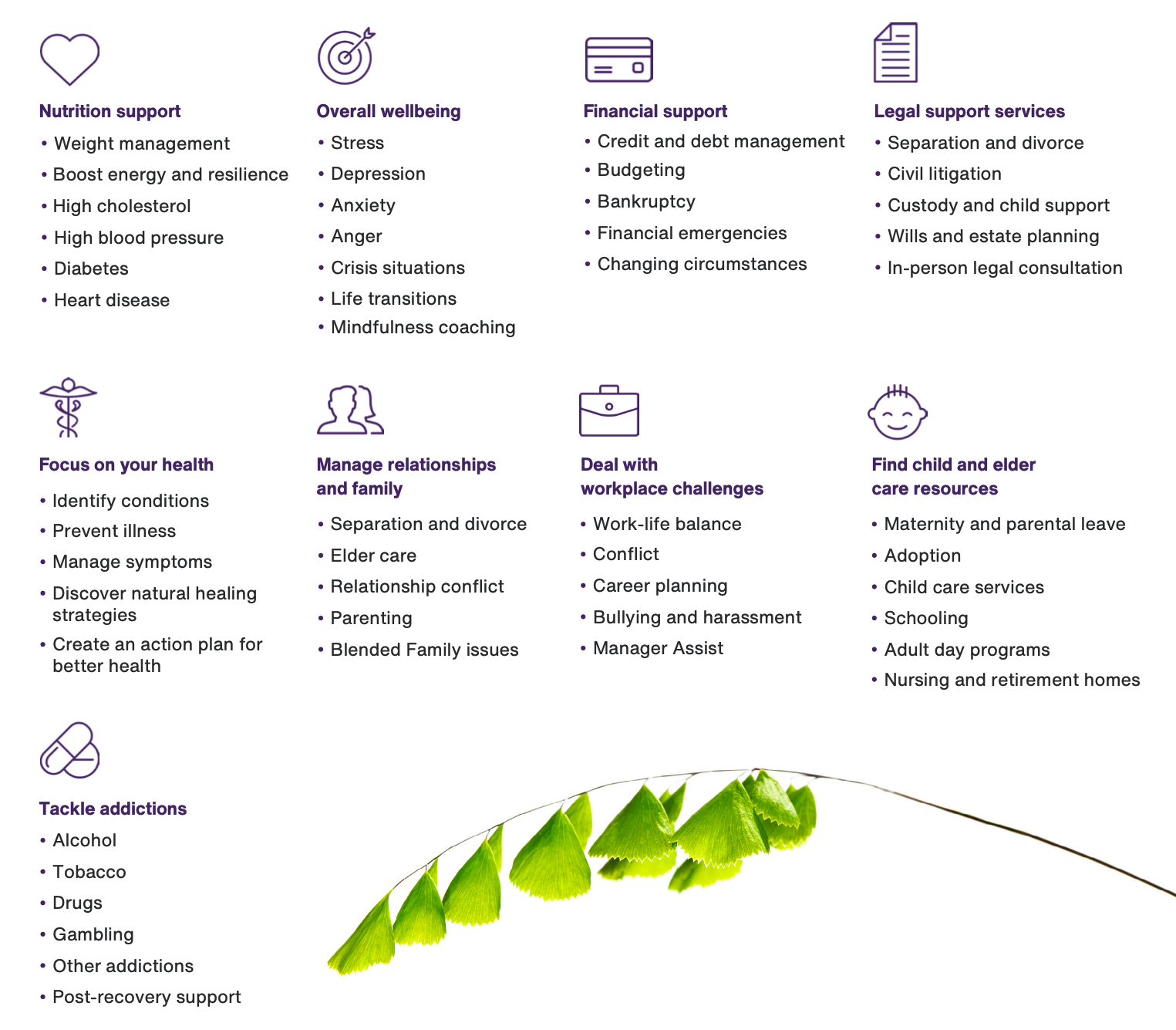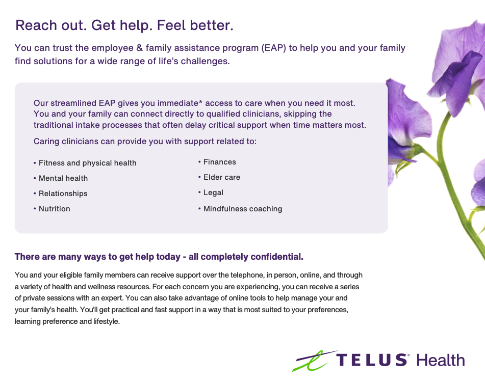 Have you taken a look at our Employee Assistance Program (EAP) through Telus Health? It gives employees and their families access to a wealth of professional counselling services and resources on subjects like: stress, depression, addiction, finances, nutrition, adoption, estate planning and much more: